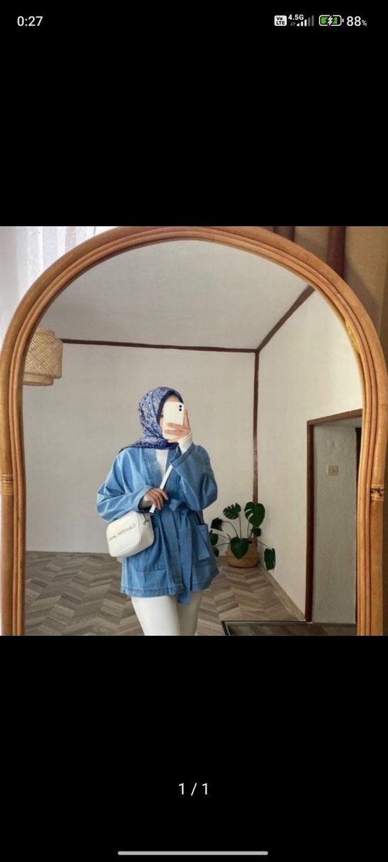 Açık mavi batik desenli kot ceket, uzun kollu ve yüksek yakalıdır. Salaş kesim ve midi boyda, sokak stiline uygun. Kuşaklı, zahmetsiz şıklık sunar.