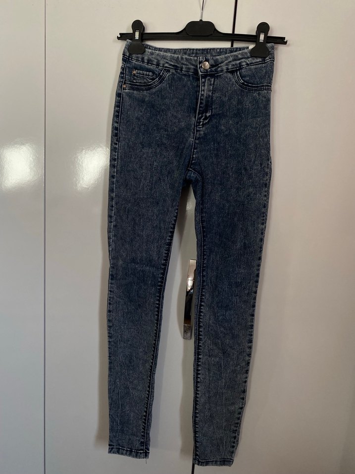 Bu kadın jean, mavi batik desenli ve bel kemerli, dar kesim midi boyda. Rahat ve şık günlük sokak stili için uygundur.