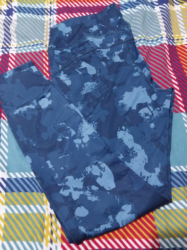 Kadınlar için mavi batik desenli, sentetik kumaştan yapılmış, vücuda oturan spor tayt. Midi boy, dış mekan kullanımı için uygundur. 3 defa giyilmiştir sorunsuzdur