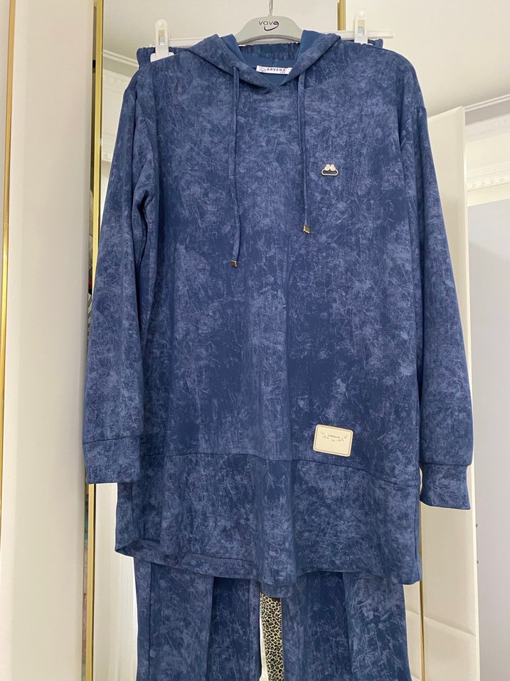 Kadın Mavi Batik Desenli Uzun Kapüşonlu Takım