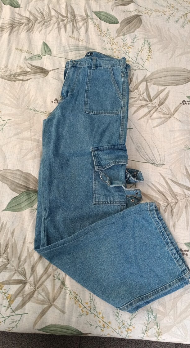 Kadınlar için bel detaylı, bol kesim mavi denim pantolon. Normal midi boyda, günlük sokak tarzına uygun.
