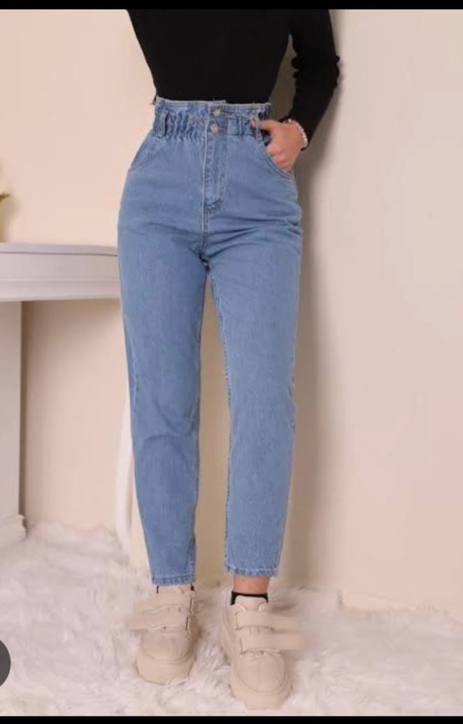 Kadınlar için bel kemerli, havuç kesin pastel mavi renkte denim jean. Midi boy ve desensiz, günlük rahat kullanım için uygundur.