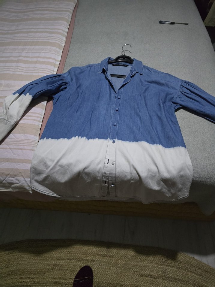 Kadınlar için mavi beyaz bağlama desenli denim gömlek, bol kesim, yakalı ve uzun kollu, düğmeli, günlük rahat kullanım için uygundur.