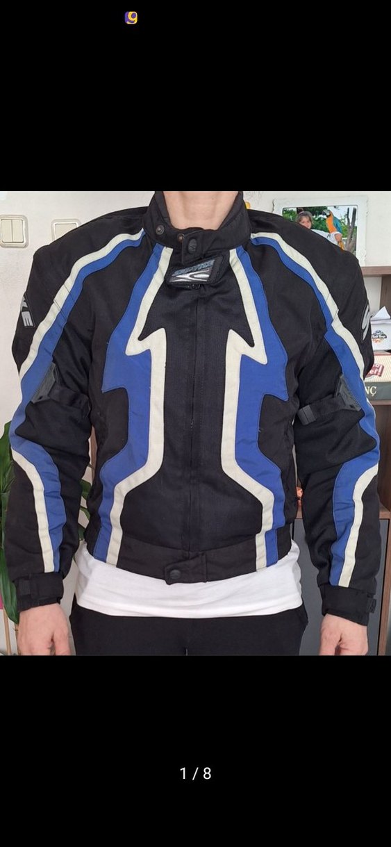 Kadın biker ceketi, yüksek yakalı ve uzun kolludur. Sentetik kumaştan, koyu mavi baskılı desene ve tokalı detaylara sahiptir. Dış mekan kullanımı için uygundur. ️ korumaları mevcut dirsek omuz sırt