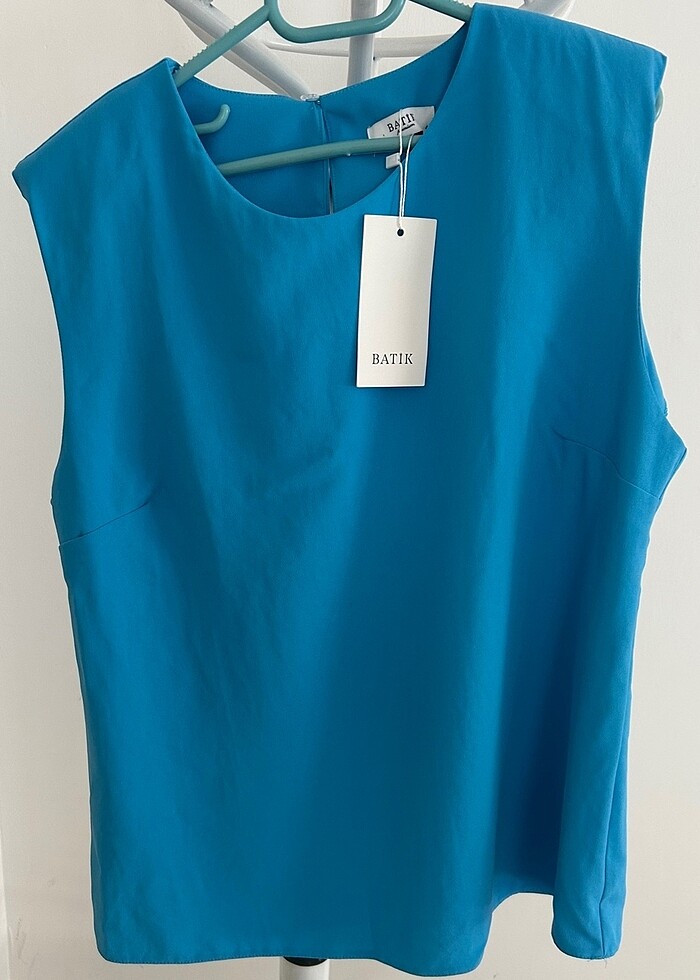 Batik marka 42 beden ( boy 67 cm, koltuk altı 53cm) kolsuz, omuzları vatkalı, mavi renk ince bluz. Yeni etiketli.