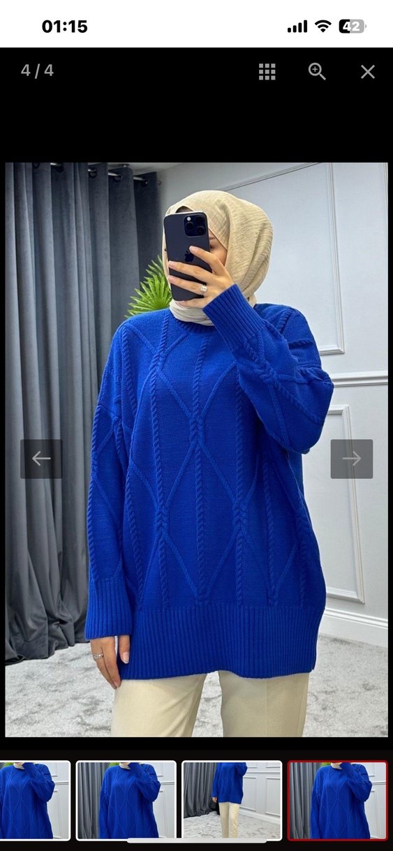 Koyu mavi örgü kumaştan, boğazlı ve uzun kollu, bol kesim kadın kazak. Desensiz, rahat ve günlük sokak stili için uygun. Ürünün giyilmiş hali mevcut değil birebir aynısı Standart bedendir Sadece bir kere giyildi