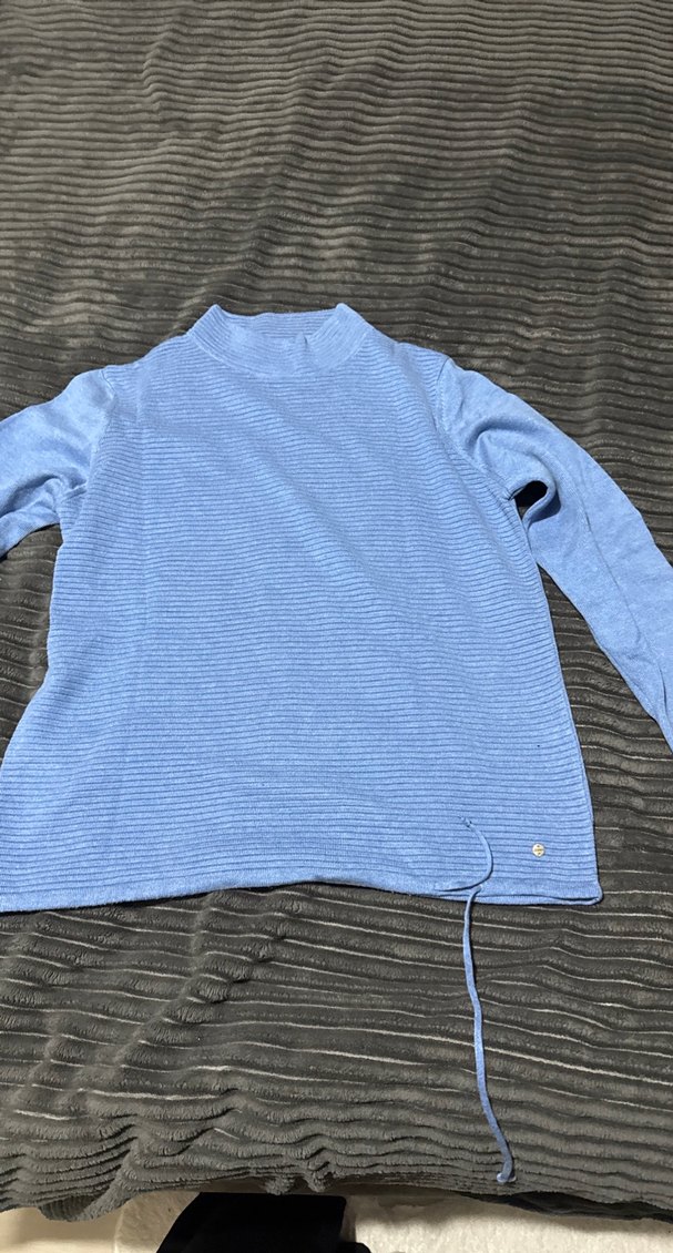Kadınlar için uzun kollu, boğazlı ve örme dokulu triko kazak. Rahat ve midi boyda, yumuşak mavi-gri renkte, günlük kullanıma uygun.