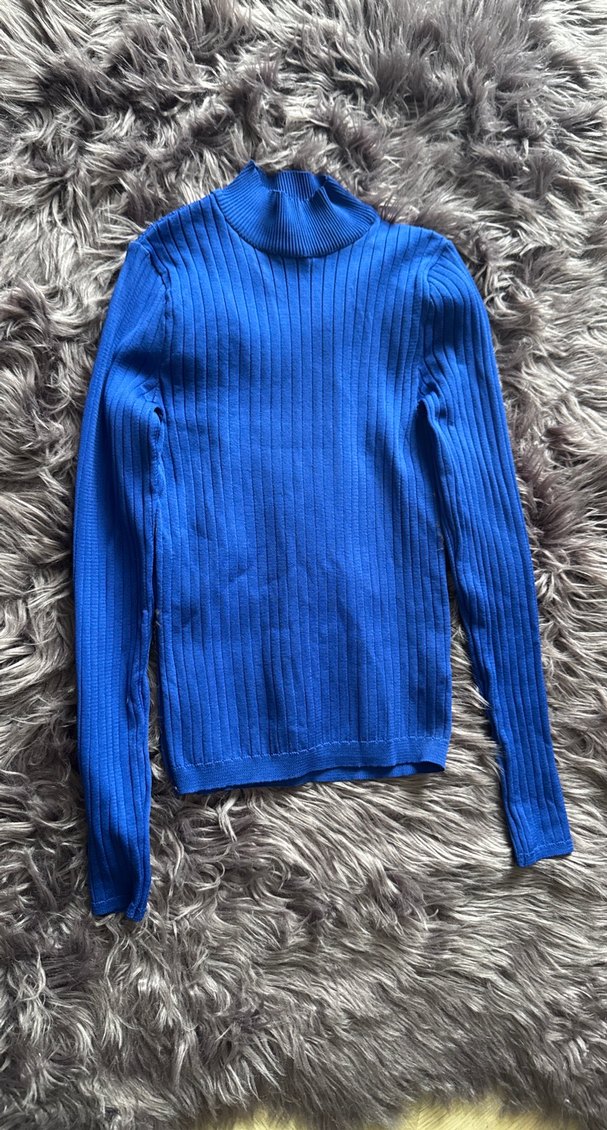 Kadınlar için boğazlı, uzun kollu ve triko örme kumaştan yapılmış, fitted kesim mavi kazak. Normal midi uzunluğunda, günlük rahat sokak tarzına uygundur.