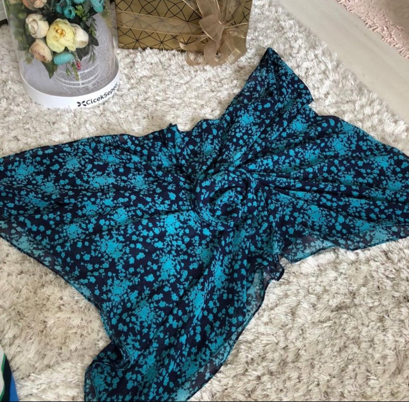 Yumuşak krep şifonna benzer kumaştan, bohem çiçek desenli ve drapeli koyu mavi kadın şalı.