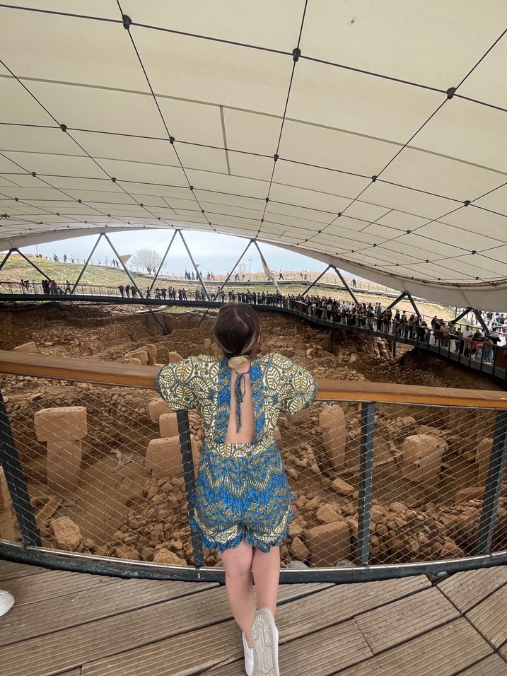 Kadınlar için koyu mavi, bol kesim, halter yaka ve askılı kollara sahip mini tulum. Bağlamalı desen ve püskül detaylarıyla dış mekan kullanımı için uygun.