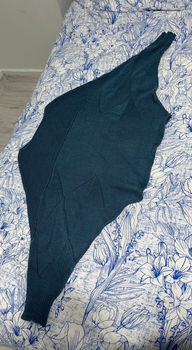 Koyu mavi örgü şal, bohem tarzda detaylı örme desenlerle rahat ve şık bir görünüm sunar. Moda tutkunları için ideal.