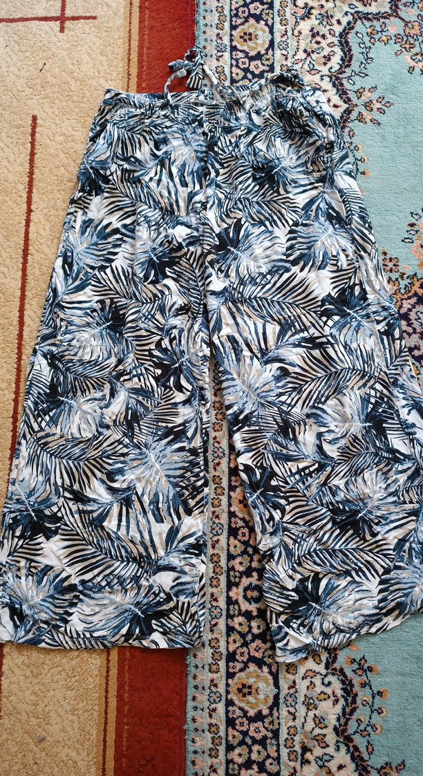 Kadınlar için uzun, bol kesim mavi tonlarında bağlama desenli, piliseli pantolon. Yumuşak sentetik kumaştan, bohem tarzda günlük kullanım için uygun.