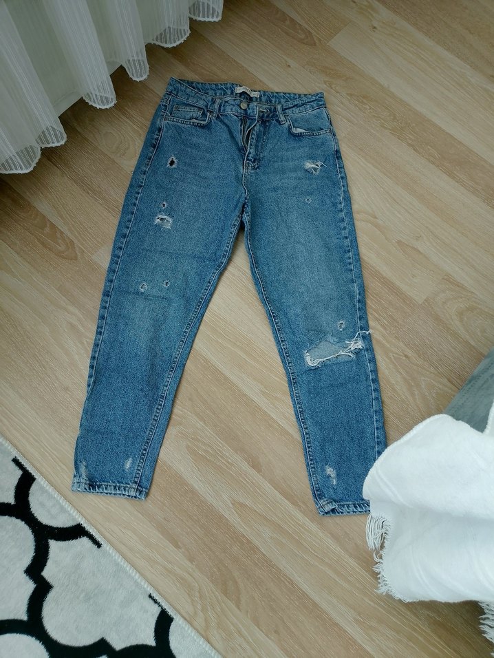 Mavi bol kesim denim jean, tokalı detay ve yıpranmış görünümlü, günlük sokak stili için uygun.