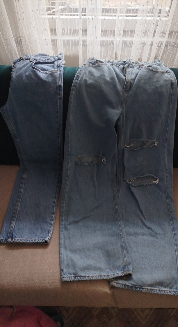 Mavi renkte, bol kesim, tokalı detaylı kadın denim jean, midi boyda, gündelik kullanıma uygun rahat stil.Pantolonlar sıfır ayarında çok az kullanıldı hiçbir defosu yok
