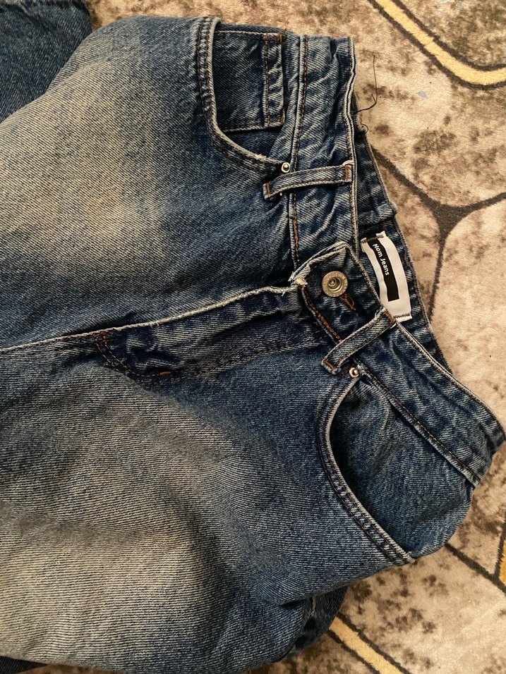 Bel kemer detaylı denim pantolon belinde çok az pens var