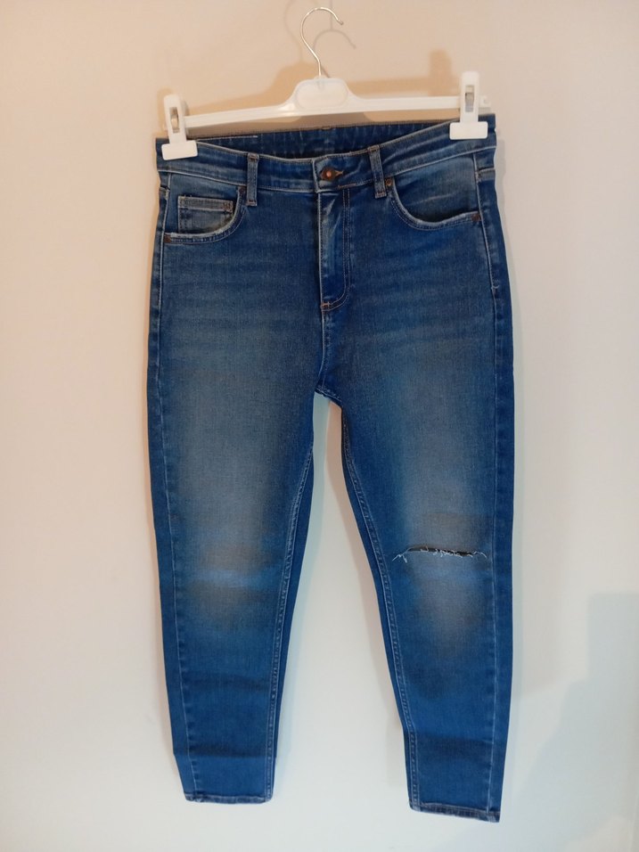 Kadınlar için mavi, bol kesim denim jean. Midi boy ve yırtık detaylı, desensiz, günlük sokak stili için uygundur. bel 40 boy 98 paça 11 cm dir.