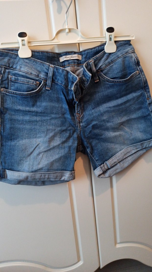 Bol kesim mavi denim mini şort, tokalı detayıyla günlük ve sokak stiline uygun rahat bir model. Desensiz tasarım.