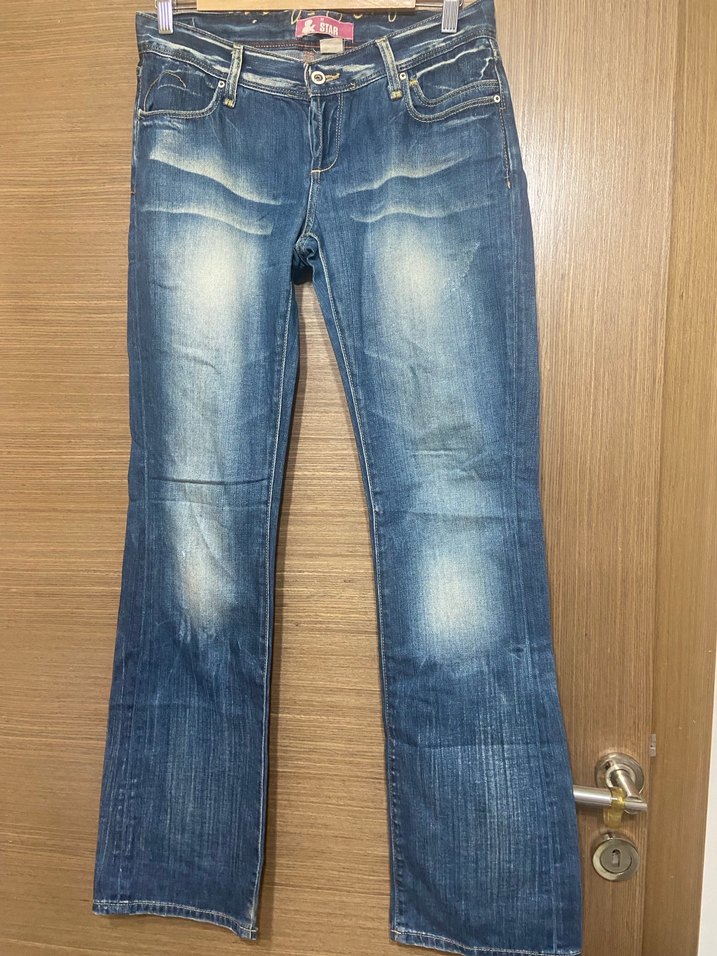 Bol kesim, parlak mavi denim kadın pantolon, tokalı detaylı. Normal midi boyda, günlük sokak stili için uygun.
