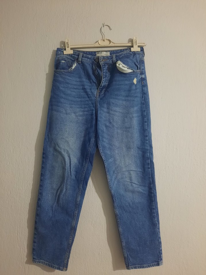 Bol kesim mavi denim pantolon, tokalı detaya sahip ve midi boyda, günlük sokak stili için uygundur.