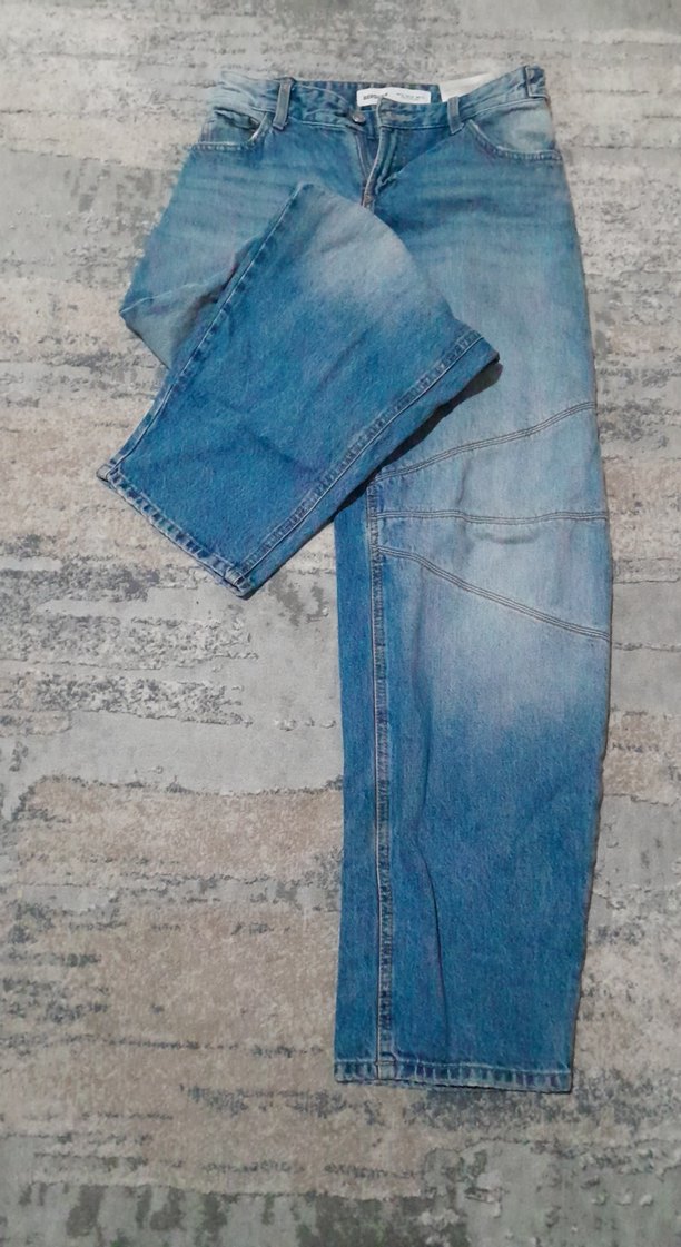 Gri ve mavi tonlarda, fermuarlı detaylı bol kesim kadın denim pantolon. Günlük sokak stili için çok uygun