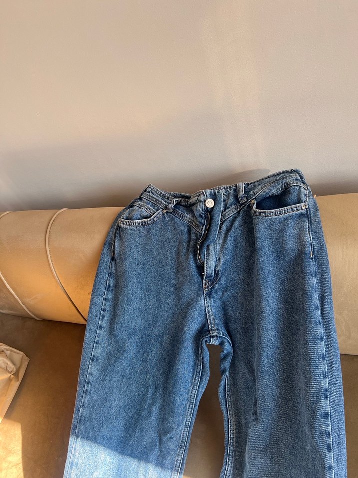 Kadınlar için bol kesim, mavi denim pantolon. Tokalı detaylı, midi boy ve günlük kullanıma uygun minimal ve normcore tarzda.