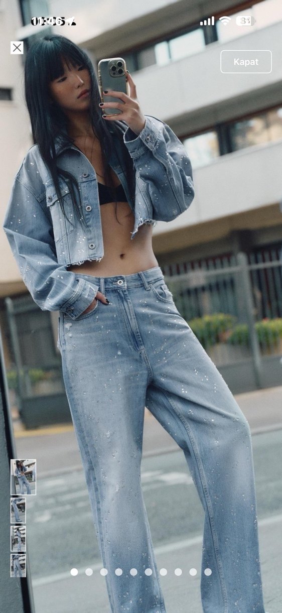 Mavi renkli, bol kesim kadın denim pantolon, bağlama desenli, günlük kullanıma uygun trend sokak stili. ✨