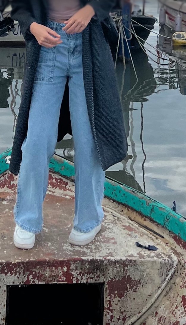 Kadınlar için bol kesim ve uzun boy mavi denim pantolon. İnce tie-dye deseni ile günlük kullanıma uygun.
