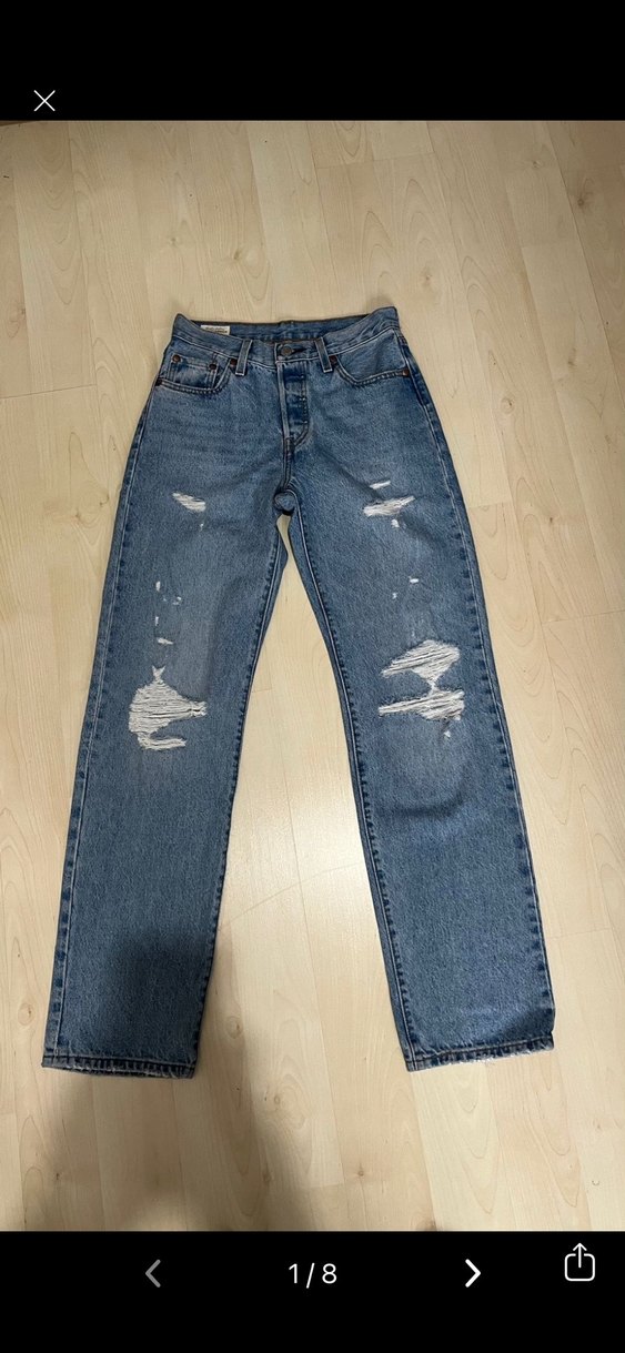 Parlak mavi renkte, bol kesim, tokalı detaylı denim pantolon. Normal boyda, sokak modasına uygun, yıpranmış görünümlü günlük kullanıma uygun.