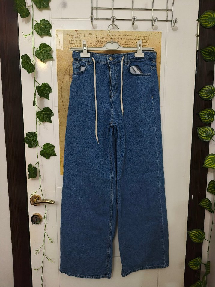 Kadınlar için bol kesim, kemerli mavi denim pantolon. Belinden daraltma yapılmıstir 38 bedenden 36 yapılmıştır, ölçüleri fotoğrafa ekledim. Kumaşı sert