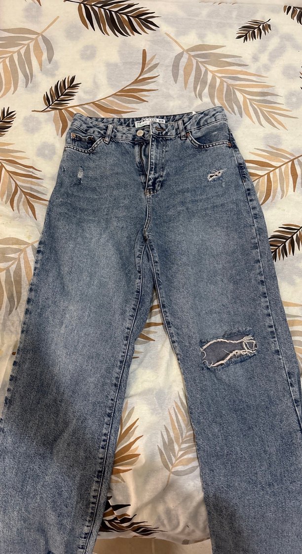 Kadınlar için bol kesim, mavi renkli, bağlamalı detaylı ve yırtık desenli midi boy denim pantolon, günlük rahat stil için uygundur.