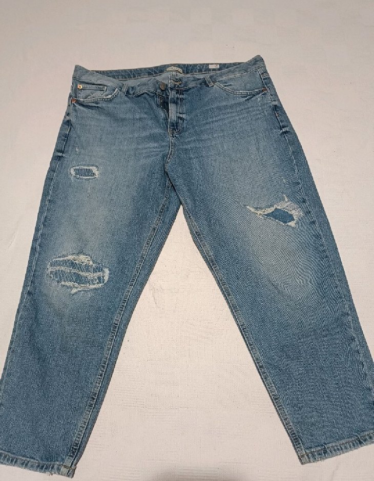 Bol kesim, mavi renkli kadın denim pantolon. Kemer tokalı ve yırtık detaylı, midi boy ve günlük kullanıma uygun sokak stili.