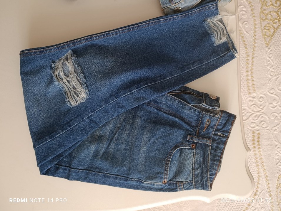 Mavi bol kesim, fermuarlı ve yırtık detaylı denim jean. Midi boy, desen içermeyen rahat sokak stili günlük kullanım için uygun.