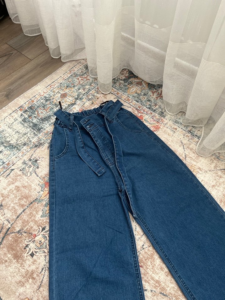 Kadınlar için kemerli, bol kesim ve uzun boylu mavi denim pantolon. Bağlamalı deseniyle günlük ve sokak stiline uygun. aldığım için şu anda bana olmuyor 155 62 61 kilolarında kullandım şu an 65 66 civarındayım açıkçası olmuyor basen kısmımdan dolayı kilom genellikle basen kısmında çünkü ama hani orantılı bir kilonuz varsa 66 da olsanız 70 de olsanız olur size. Esnek oldukça likralı bir pantolon boyunu vs kestirmedim katlayarak kullandım yani bir 1.61 65’e kadar da olur belli lastikli genişliyor ayriyeten de kendi kemeri var kot olarak bu şekilde..