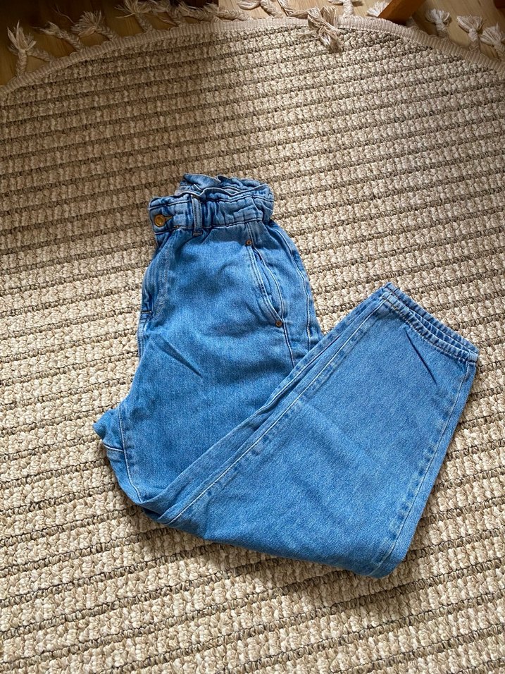 Kadınlar için kemerli, bol kesim, mavi denim pantolon. Normal midi boyda, günlük rahat kullanıma uygun normcore tarzda.