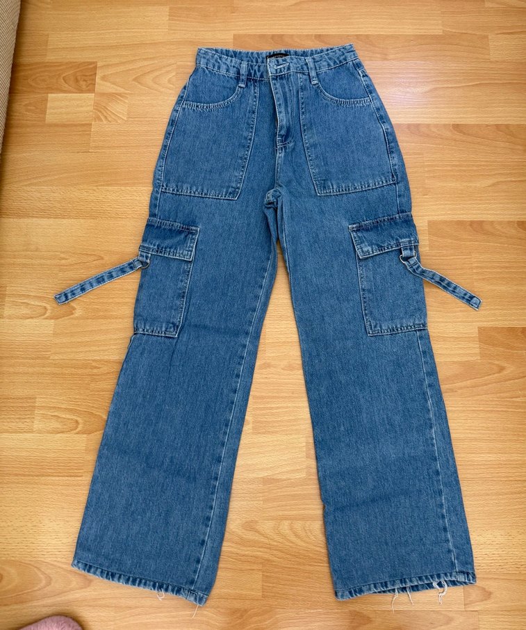 Bol kesim, kemerli mavi denim kadın jean pantolon. Çok cepli, midi boyda ve günlük sokak stili için uygun.
