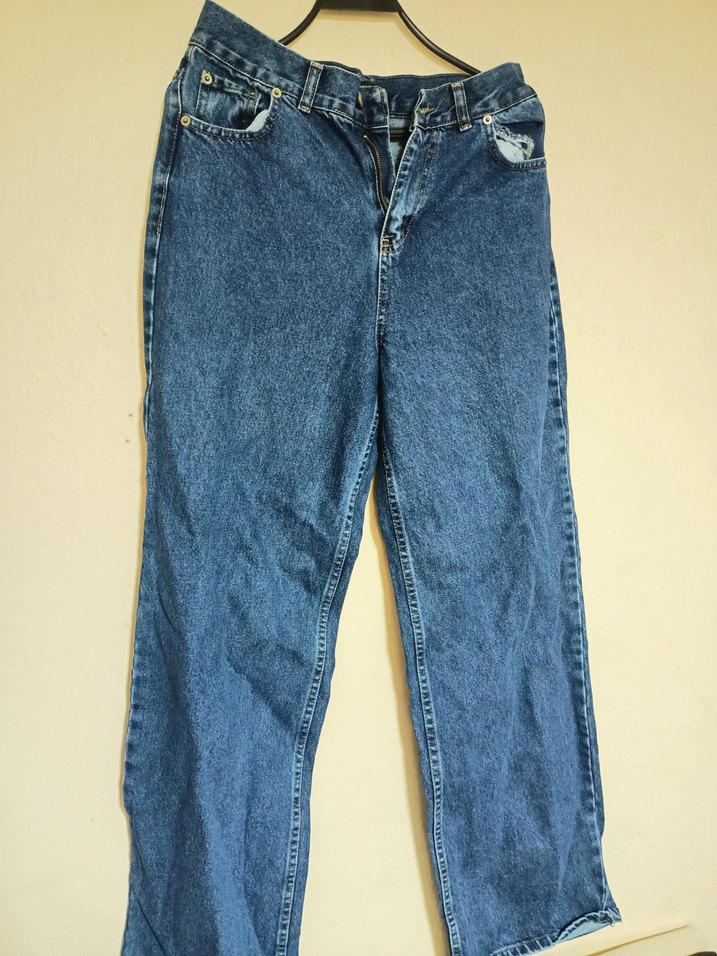 Mavi denimden üretilmiş, bol kesim ve normal boyda, tokalı detaylı kadın kot pantolon. Günlük kullanım için uygundur.