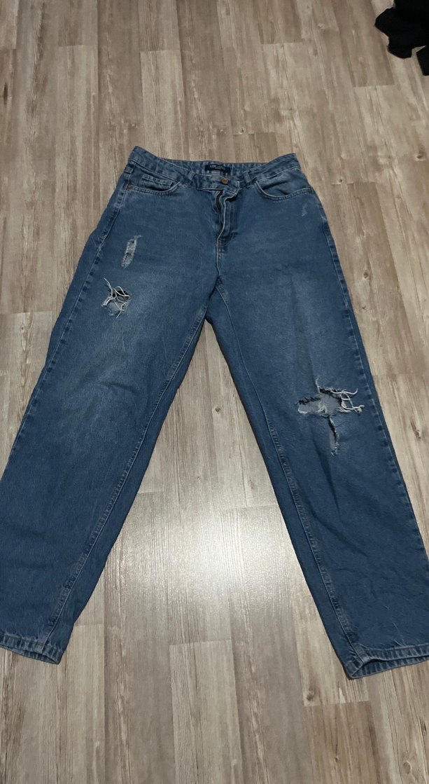 Mavi bol kesim kot pantolon, tokalı ve yırtık detaylı, günlük rahat kullanım için uygundur.