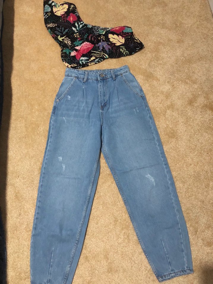 Mavi denimden yapılmış, bol kesim ve kemerli bel detayına sahip kadın kot pantolon. Normal boyda ve hafif batik desenlidir, günlük kullanıma uygundur.