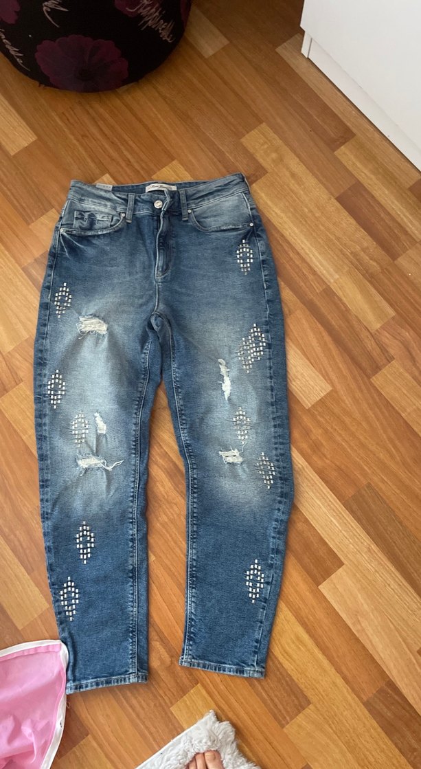 Bol kesim, normal boyda kadın mavi kot pantolon. Yırtık ve tokalı detaylarla gündelik kullanıma uygun casual tarzda.
