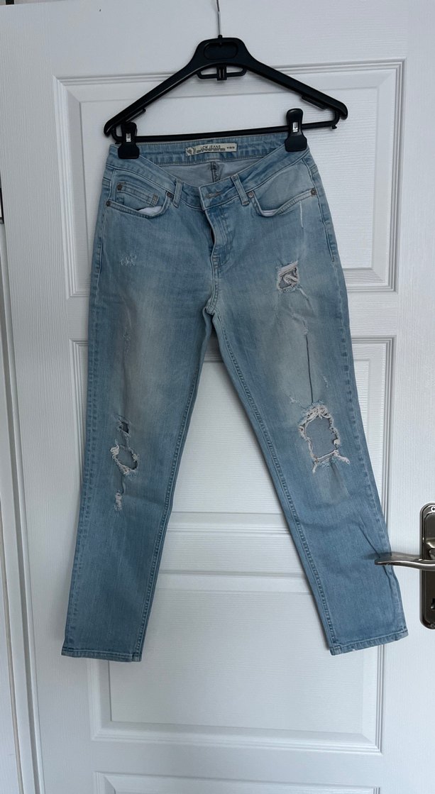 Bol kesim, mavi denim kot pantolon. Midi boy ve tokalı detaylara sahip, günlük kullanıma uygun sokak stili.