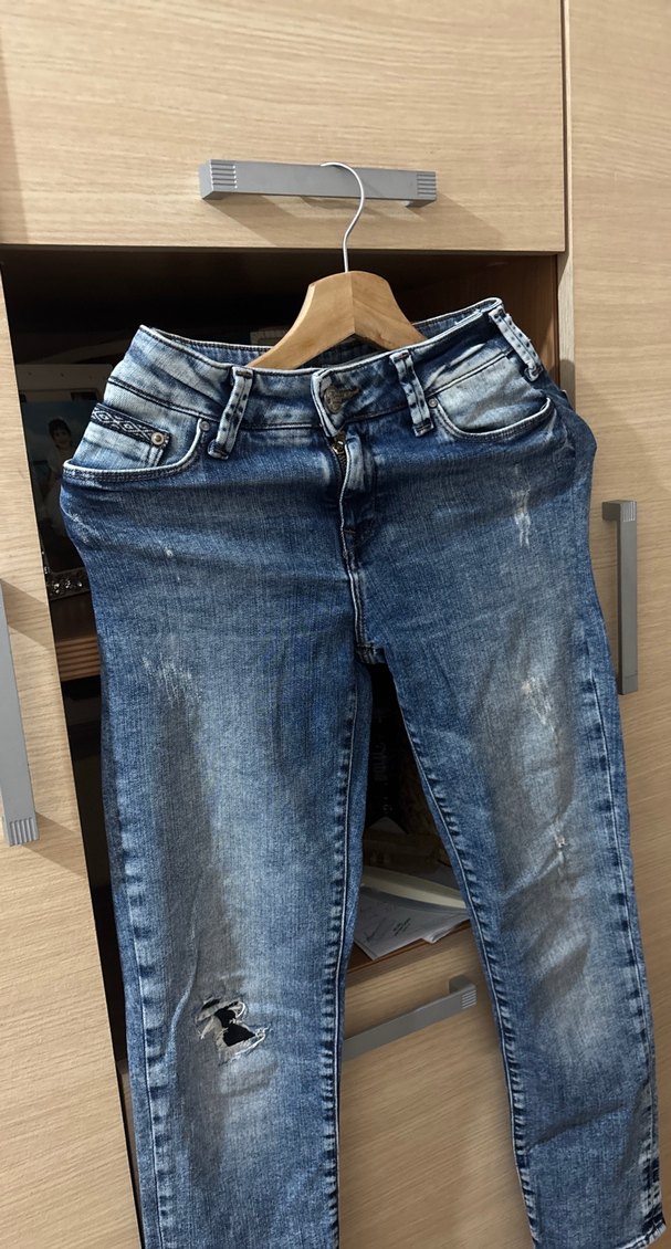 Kadınlar için mavi-gri renkte, bol kesim ve midi boy kot pantolon. Tokalı detaylı, günlük rahat sokak stili için uygundur.