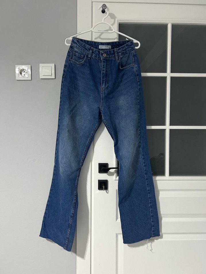 Kadınlar için bol kesim, midi boy mavi kot pantolon. Kemer tokası detaylı, gündelik rahat normcore tarzda jeans.