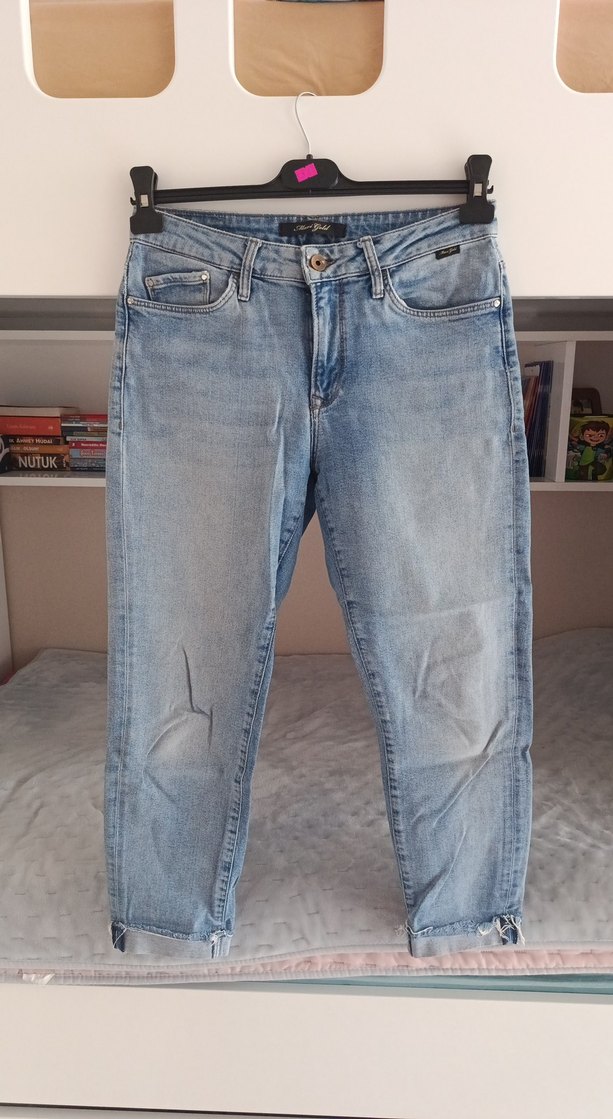 Gri tonlarında mavi bol kesim kadın denim pantolon, tokalı detaylıdır. Midi boyda, günlük kullanıma uygun sade sokak stili pantolon.
