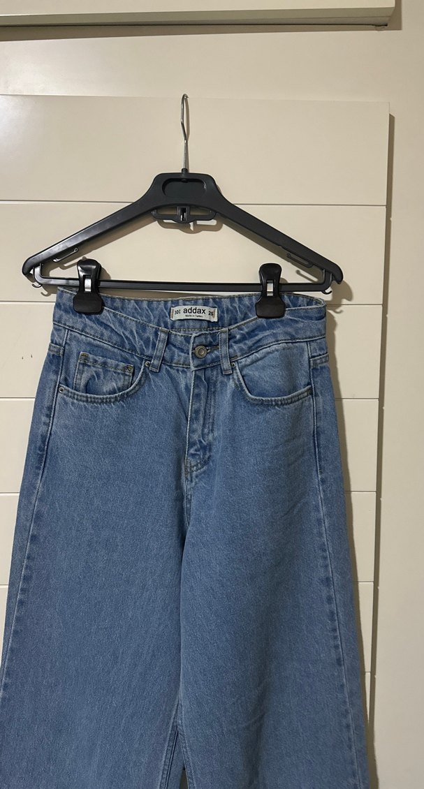 Mavi bol kesim, tokalı denim pantolon. Midi boy, desen içermeyen ve günlük kullanıma uygun rahat bir model.