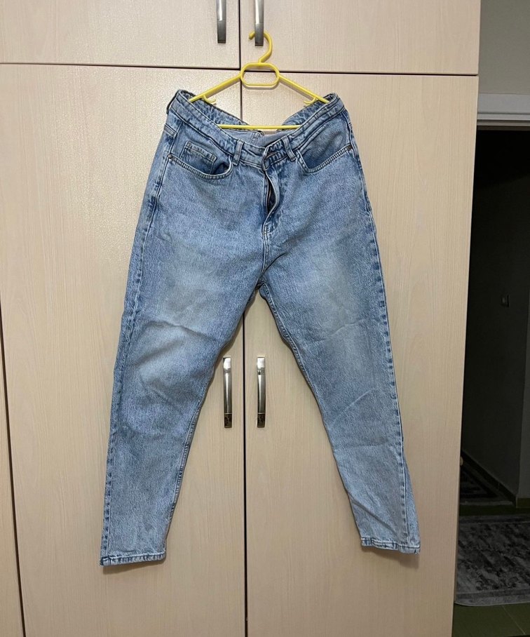 Beltli, bol kesim mavi denim kot pantolon. Pastel tonlarda, günlük kullanıma uygun rahat bir model.