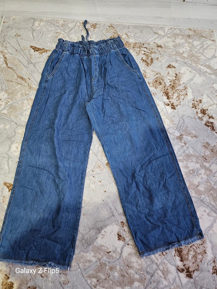 Günlük kullanıma uygun, bol kesim mavi denim kot pantolon. Midi uzunlukta, rahat ve şık bir sokak stili sunar.