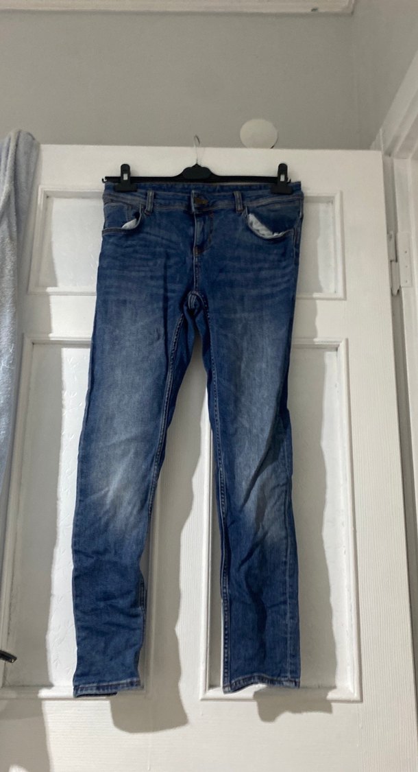Bol kesim mavi denim kot pantolon, normal midi boy ve tokalı detaylarla günlük sokak stili için uygundur.