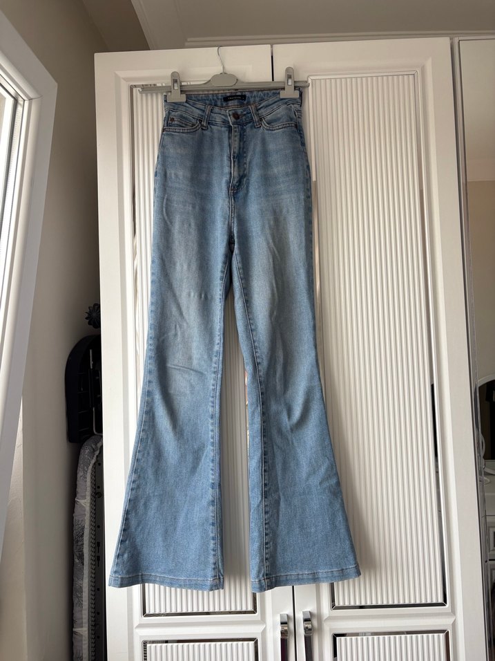 Pastel mavi renkte, bol kesim, midi boy kot pantolon. Tokalı detayı ve desensiz yapısıyla gündelik kullanıma uygun.