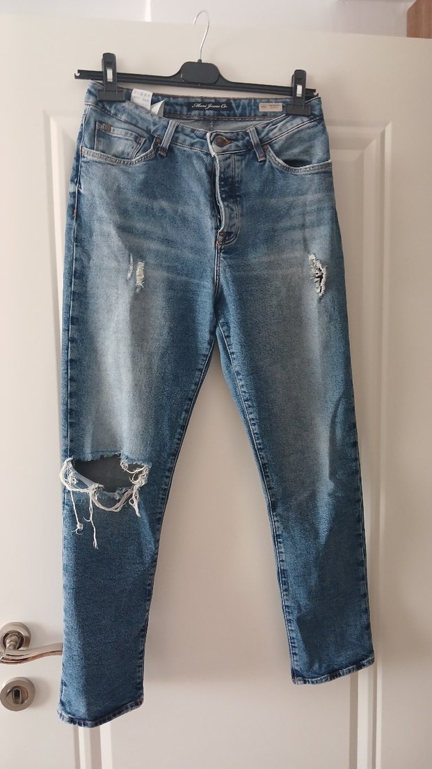 Kadın mavi denim bol kesim midi uzunlukta, tokalı detaylı kot pantolon. Günlük kullanıma uygun, rahat ve yırtık detaylı sokak stili.