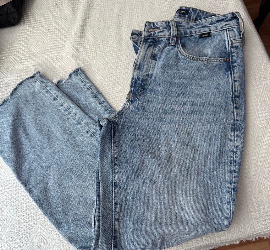 Kadınlar için bol kesim, mavi renkte, kemerli detaylı bilekte biten kot pantolon. Rahat ve günlük sokak stili için uygundur.